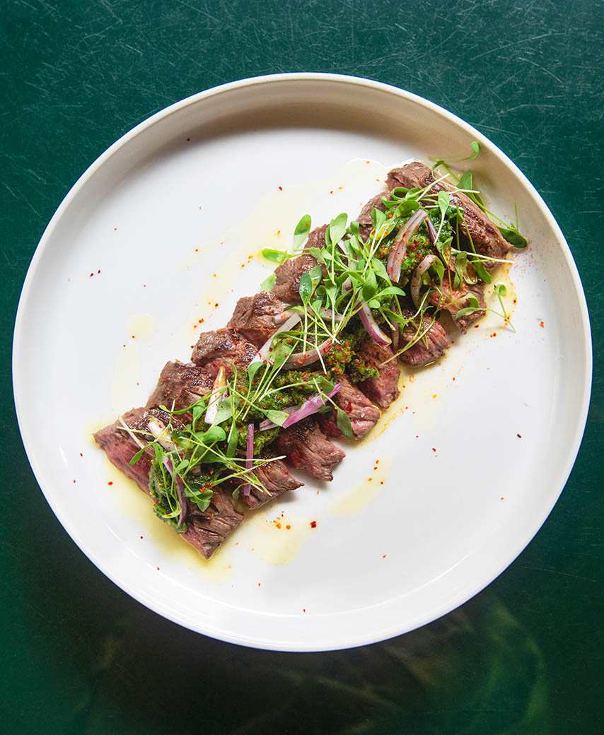 - Kruid de onglet met zout en laat hem 20 minuten op kamertemperatuur komen.